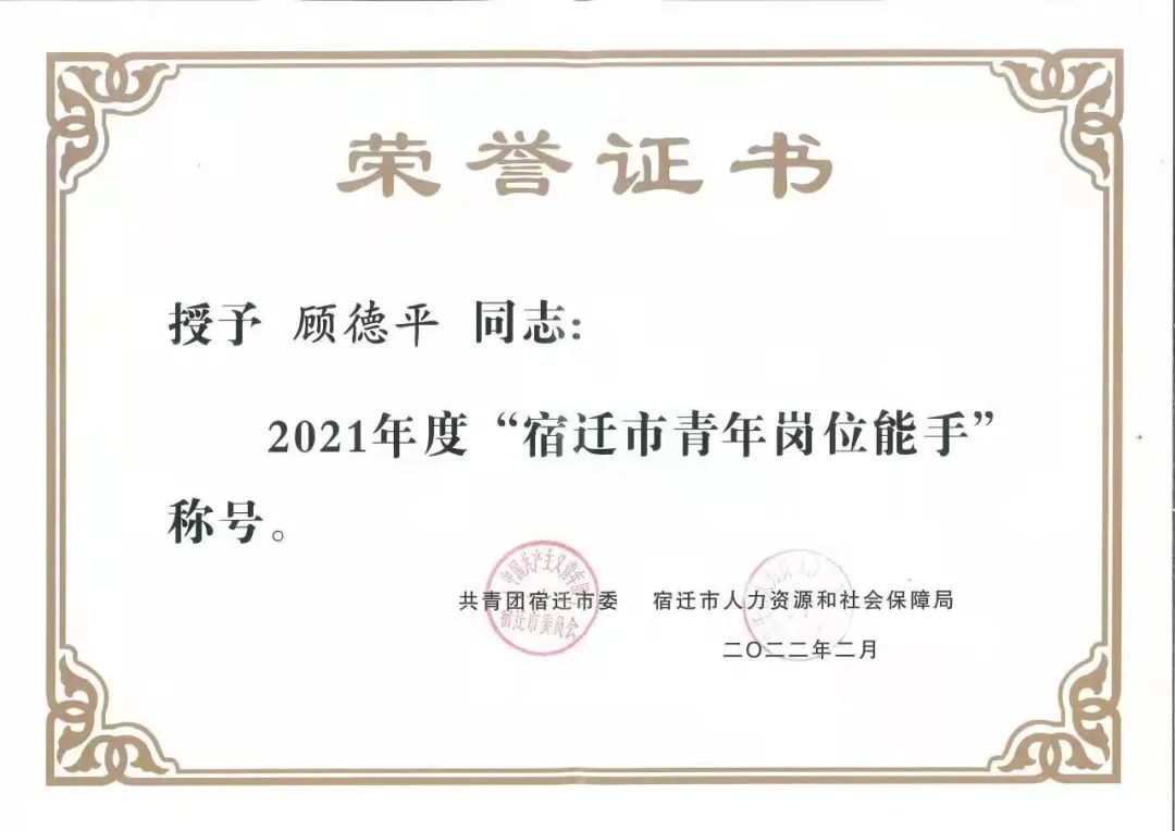 【宿遷交建】宿遷交建顧德平榮獲2021年度“宿遷市青年崗位能手”稱號
