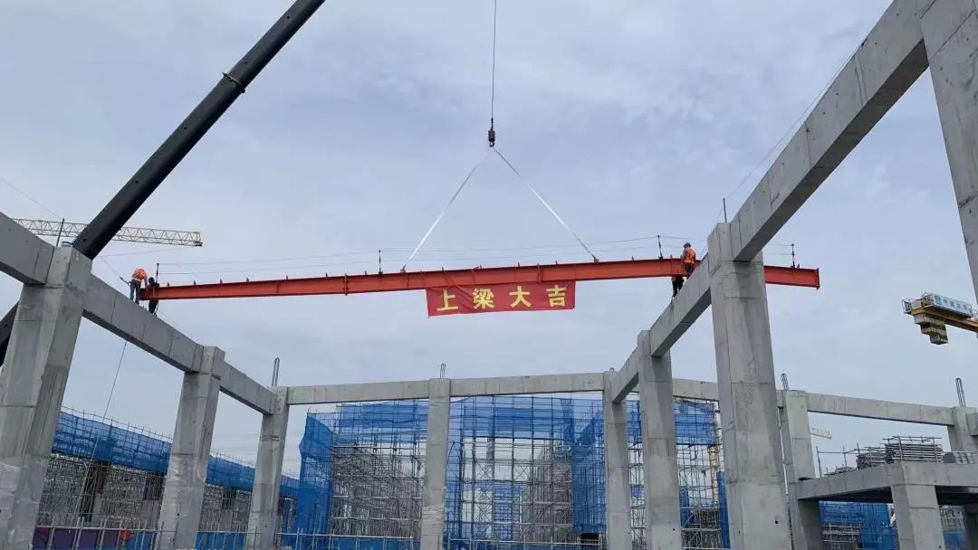 【通湖物流園】“鋼”立天地,“構(gòu)”筑未來(lái),江蘇通湖物流園二期工程屋面首根鋼梁吊裝完成