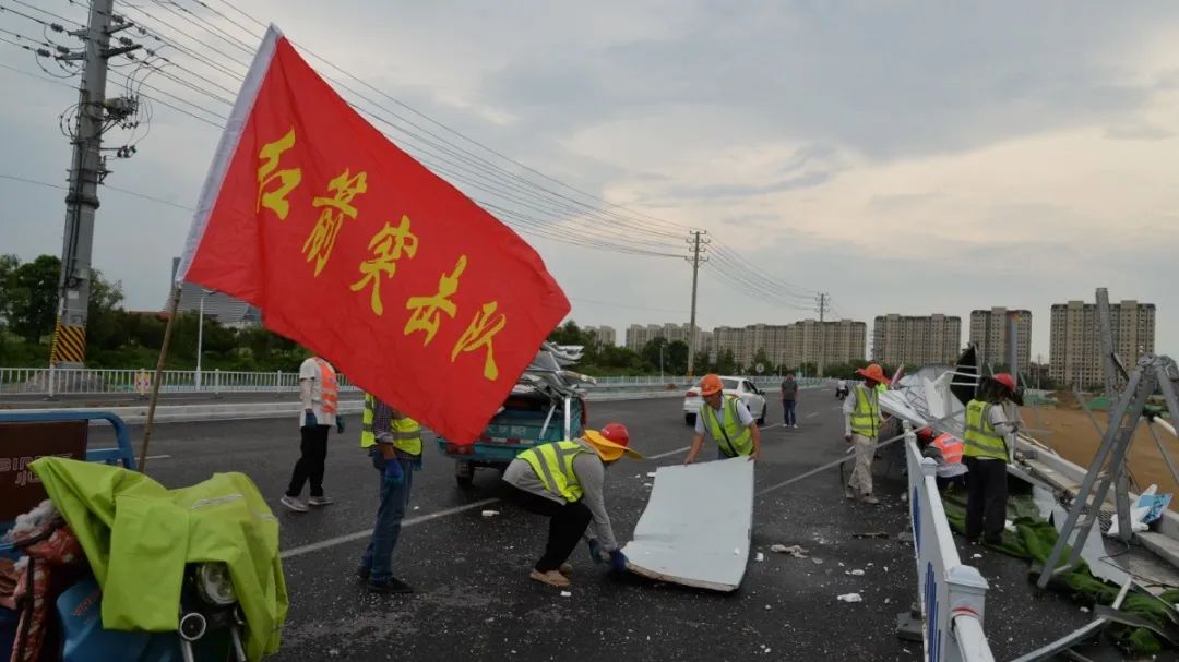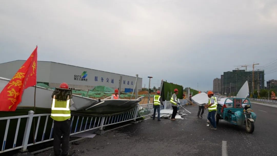 在狂風(fēng)和暴雨的雙重襲擊下,現(xiàn)場(chǎng)的圍擋出現(xiàn)了部分倒伏損毀的情況,面對(duì)現(xiàn)場(chǎng)的情況,宿遷交建工程項(xiàng)目黨支部迅速組織“紅箭突擊隊(duì)”第一時(shí)間趕往現(xiàn)場(chǎng),全體黨員顧不上圍擋上鋒利的邊角和突出的螺釘,抓緊時(shí)間對(duì)損壞處進(jìn)行清理和維護(hù),及時(shí)消除道路安全隱患,確?,F(xiàn)場(chǎng)道路交通通暢。