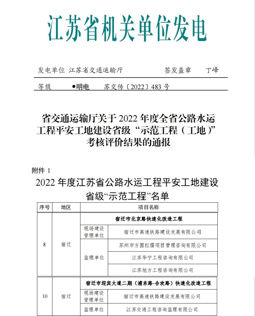 近日,江蘇省交通運輸廳對2022年度全省公路水運工程平安工地建設(shè)省級“示范工程(工地)”名單進行了公示,宿遷市北京路快速化改造工程、宿遷市迎賓大道二期(浦東路-合歡路)快速化改造工程2個項目獲評江蘇省公路水運工程平安工地建設(shè)省級“示范工程”稱號。
