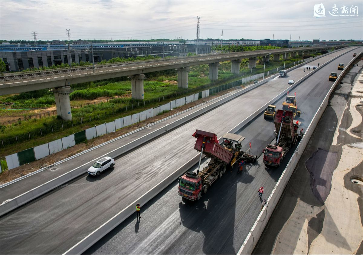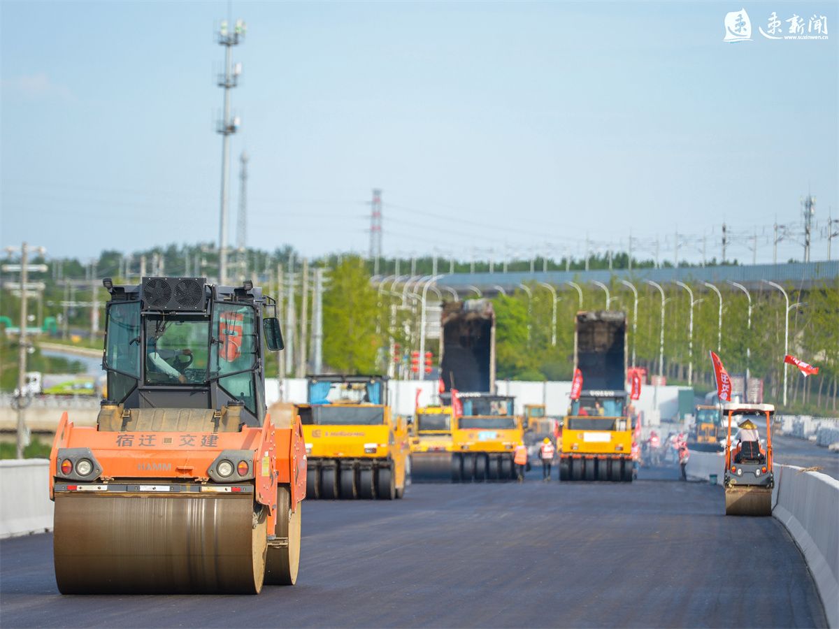 6月1日,在宿遷市港城路上跨鐵路專用線橋梁工程建設現(xiàn)場,工人正在緊張施工,大型機械來回穿梭,加快推進項目建設。