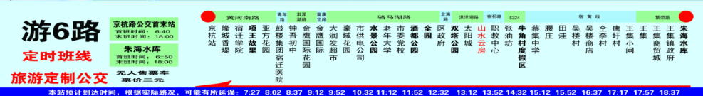 游6路始發(fā)點(diǎn)為京杭路公交調(diào)度站,終點(diǎn)站在宿城區(qū)王集鎮(zhèn)朱海水庫(kù)度假區(qū),全程約32公里,共設(shè)置了35個(gè)站點(diǎn),單程票價(jià)為2元,可享受城市公交刷卡等優(yōu)惠政策。運(yùn)行時(shí)間為早上6:40至晚上18:00,線路采取定點(diǎn)發(fā)班,班次間隔約為50分鐘,后續(xù)將視客流情況調(diào)整運(yùn)營(yíng)班次及發(fā)車(chē)間隔。