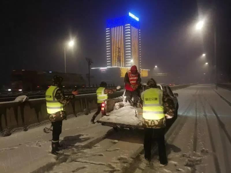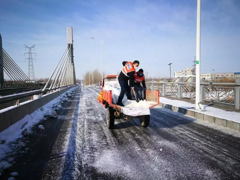 養(yǎng)護(hù)人員首先對(duì)道路、橋梁坡道、匝道、彎道等處撒上融雪劑、工業(yè)用鹽,再利用多臺(tái)除雪設(shè)備采用人機(jī)混合梯隊(duì)作業(yè)的形式進(jìn)行除雪鏟冰工作,確保三號(hào)橋、七號(hào)橋、發(fā)展大道橋等重點(diǎn)橋段全線車道無(wú)積雪、無(wú)結(jié)冰。截至16日凌晨2點(diǎn)左右,共出動(dòng)養(yǎng)護(hù)人員70多名、裝載機(jī)4臺(tái),投入運(yùn)輸車輛10臺(tái),調(diào)集使用融雪劑40噸、工業(yè)鹽50噸。