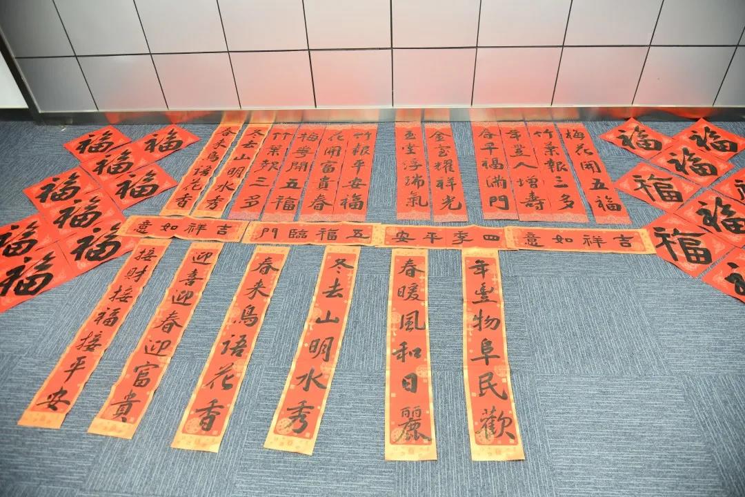“無(wú)聯(lián)不成春,有聯(lián)春更濃”?;顒?dòng)現(xiàn)場(chǎng),一幅幅飽含吉祥寓意的春聯(lián)、一個(gè)個(gè)“福”字逐漸鋪滿兩邊的桌子和地上。行、隸、小篆等多種書(shū)體各顯神韻,滿場(chǎng)墨香包含著大家濃濃的祝福和對(duì)新年的期盼。