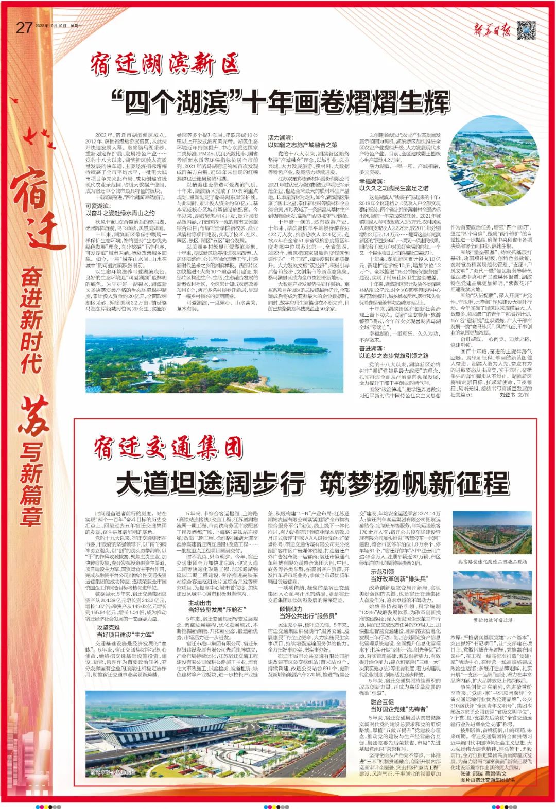 10月10日,《新華日?qǐng)?bào)》以《宿遷交通集團(tuán):大道坦途闊步行 筑夢(mèng)揚(yáng)帆新征程》為題,專題報(bào)道了集團(tuán)過(guò)去五年從融資平臺(tái)公司到綜合性交通投資運(yùn)營(yíng)集團(tuán)成功轉(zhuǎn)型的發(fā)展歷程。全文報(bào)道如下:
