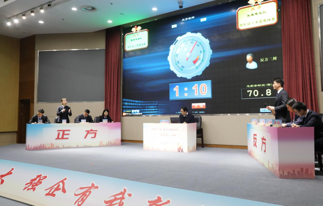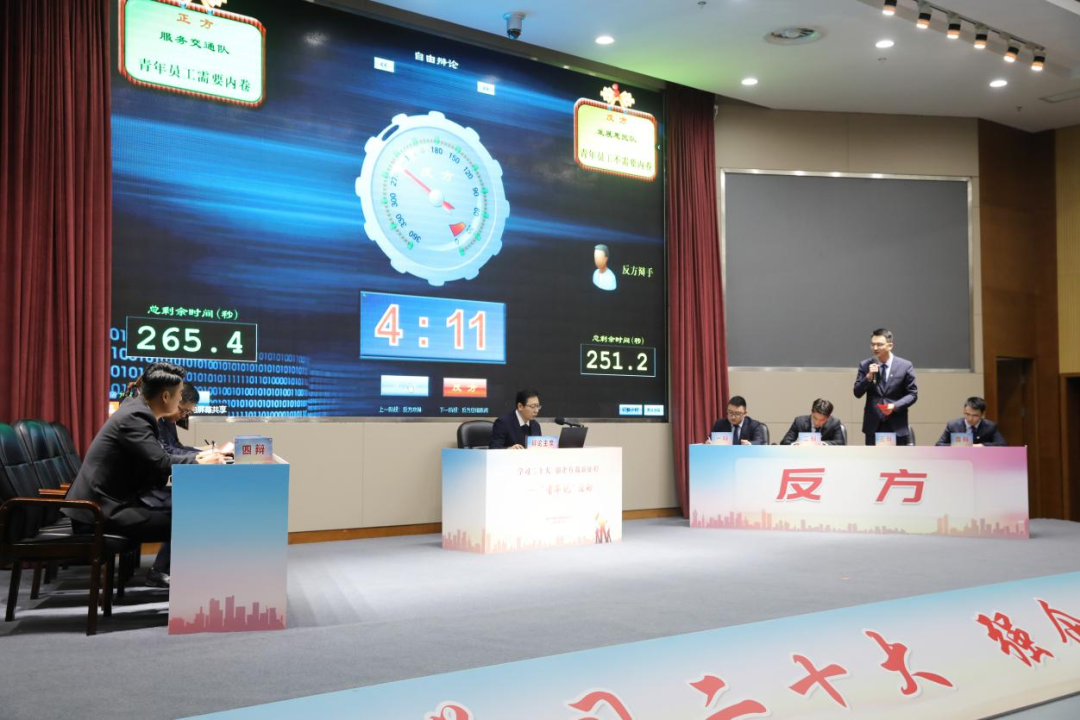 活動(dòng)中,在辯論主席介紹完比賽流程,雙方隊(duì)員自我介紹之后,比賽正式開始。正方“服務(wù)交通隊(duì)”和反方“發(fā)展惠民隊(duì)”以“青年員工需不需要內(nèi)卷”為主題開展了一場(chǎng)別具一格、亮點(diǎn)紛呈的辯論賽。雙方選手注意力集中,在開篇立論、一對(duì)一攻辯、自由辯論和最終結(jié)辯環(huán)節(jié)中,集團(tuán)8位青年辯手思路清晰、觀點(diǎn)明確,旁征博引、侃侃而談,將比賽一次又一次推向高潮,現(xiàn)場(chǎng)觀眾也被帶入到緊張的氛圍之中。最后,經(jīng)過專家點(diǎn)評(píng)和集團(tuán)領(lǐng)導(dǎo)班子成員投票,正方一辯和反方三辯分別獲得“最佳辯手”稱號(hào)。