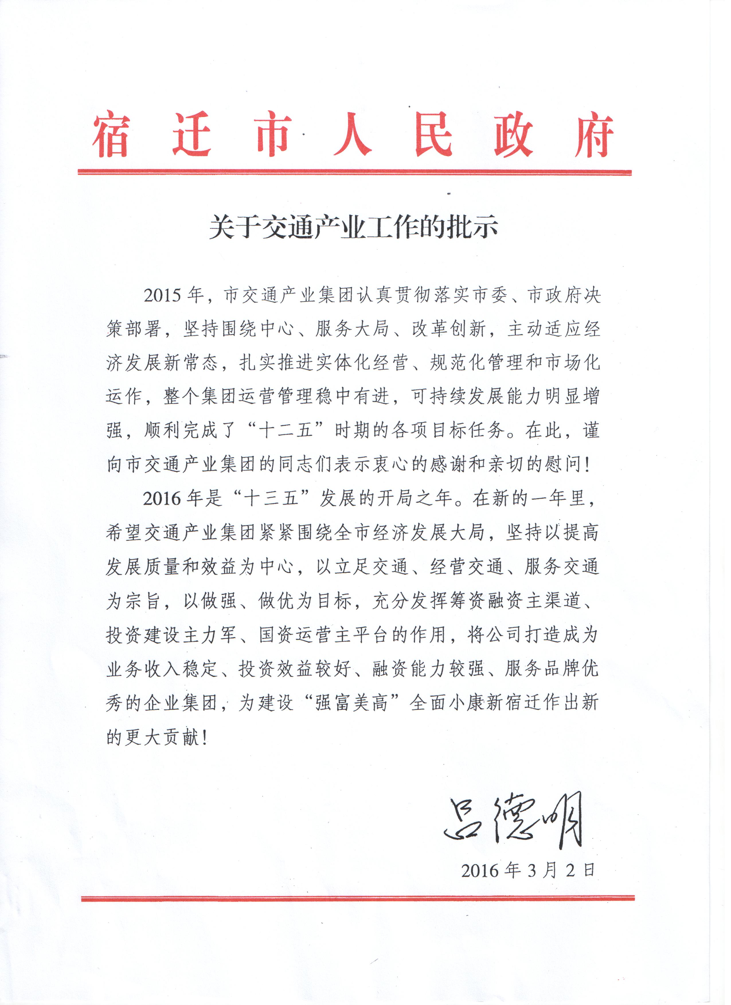 市委常委、常務(wù)副市長(zhǎng)呂德明關(guān)于交通產(chǎn)業(yè)工作的批示